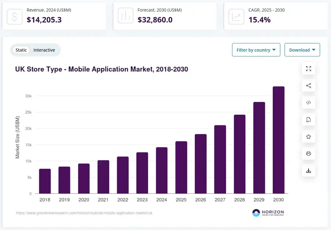 Do you run a business or have a brand idea in the UK? The time for being in an offline profession has gone. The UK app market is growing at a 15.4% CAGR rate and will reach $32.9 billion in 2030.